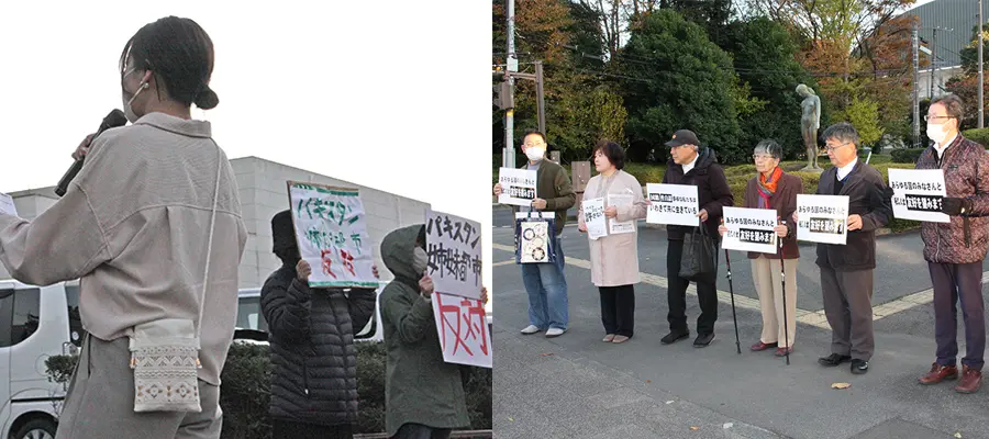 市役所本庁前では「市長は会見して説明を」「パキスタン人による犯罪が増えかねない」との声が上がった一方、カウンターとして「多様な私たちは共に生きている」「あらゆる国のみなさんと私は友好を望みます」と差別反対への思いが広がった。