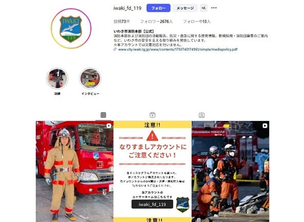 いわき市消防本部の公式インスタ なりすましアカウント確認 注意呼びかけ