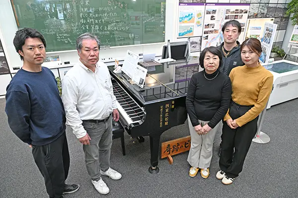 (写真:奇跡のピアノを囲む遠藤洋さん=左から2人目=ら)