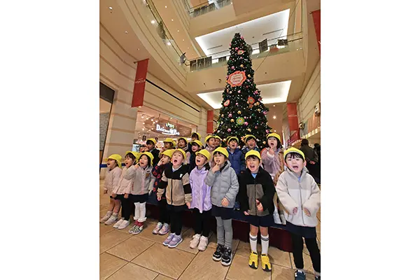 社会福祉法人慈心会が運営する「さくら保育園」(好間町下好間、白土昌子園長)の年少児24人は18日、JRいわき駅前の「ラトブ」を訪れ、1階に置かれた約7mのクリスマスツリーの前で「赤鼻のトナカイ」を元気いっぱい披露した。