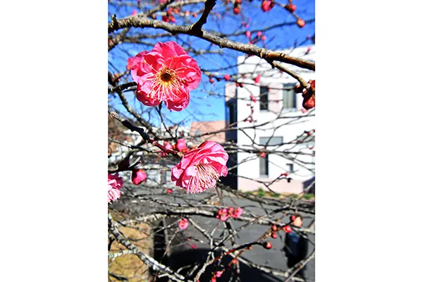 梅の木は2002(平成14)年の開院前からあり、『早咲き』として親しまれている。ここ数年は遅くとも正月、松の内の明けには開花していたが、昨年はひと月ほど開花が遅れてやきもきとさせていただけに、いつもの姿に戻り、皆ほっとひと安心。