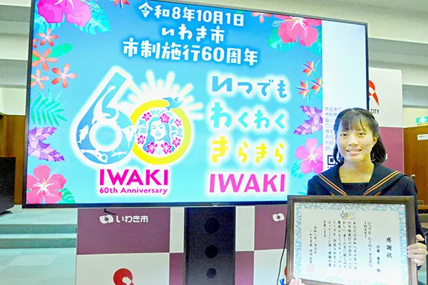 今年10月のいわき市制施行60周年に合わせ、記念キャッチフレーズが「いつでも わくわく きらきら IWAKI」に決定した。考案したのは平二中・1年の内藤愛美さん(13)で、寄せられた381点の中から最終選考の5つの案を基に、市民投票で最も多かったため選ばれた。