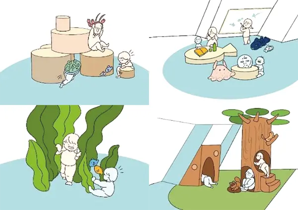 「わくわくてーぶる(触覚エリア)」では自然素材に触れながら、自由な発想を育む工作スペース。「ごろごろひろば(全身エリア)」は赤ちゃんがゆったり過ごせるよう、親子で水槽を眺めながらごろごろしたり、動物の巣穴にもぐりこんだりできる。
