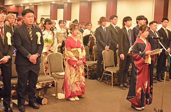 代表あいさつでは、手塚柚葉さん(20)が看護師を夢見て学ぶ日々を示しながら、「私たちは多くの方に支えられて成長してきました。家族や先生方、友人、地域の皆さまのおかげで、きょうという大切な日を迎えられました」と語った。