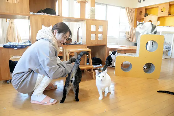(写真:シェルターで猫とふれあうリスタの鈴木さん)