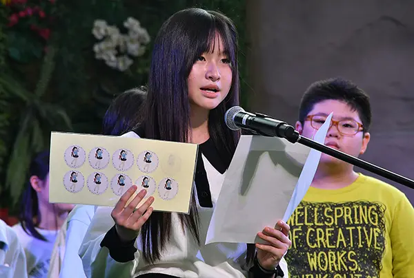 (写真:試作品のシールを見せて堂々と発表する児童)