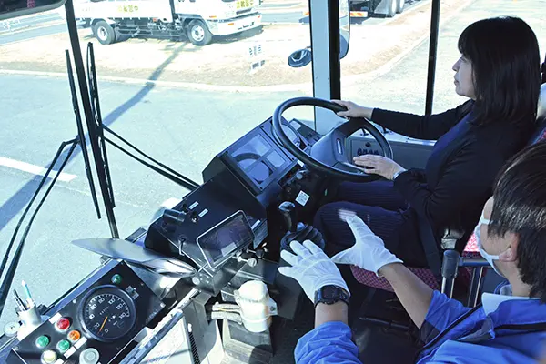 (写真:教官の案内でバスの運転体験に臨む参加者)