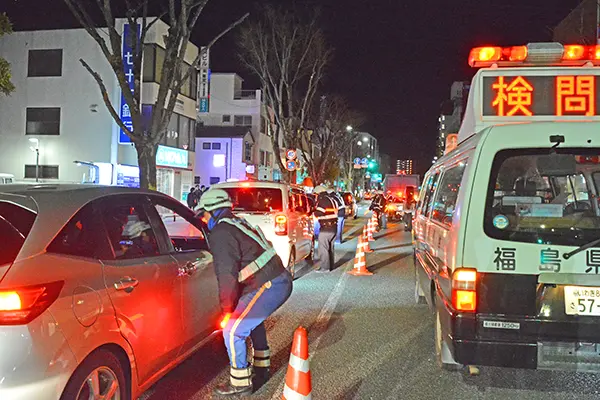 検問は平字三町目のいわき駅前大通り(国道399号)と本町通りで展開し、ドライバーに運転免許証の提示を求めたほか、飲酒の有無を確認。ドライバーに対する啓発を兼ね、交通ルールの順守を呼びかけた。