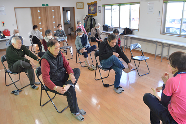 20日の回では、市シルバーリハビリ体操指導士の永山和子さん、堀江裕さんが上・下半身、両足の指を強化するストレッチを紹介した。参加者は筋力強化、歩行時の踏ん張る力を養うため、ゆっくりと両肩を回し、足の指を伸ばすなど、真剣な表情で体操に取り組んだ。
