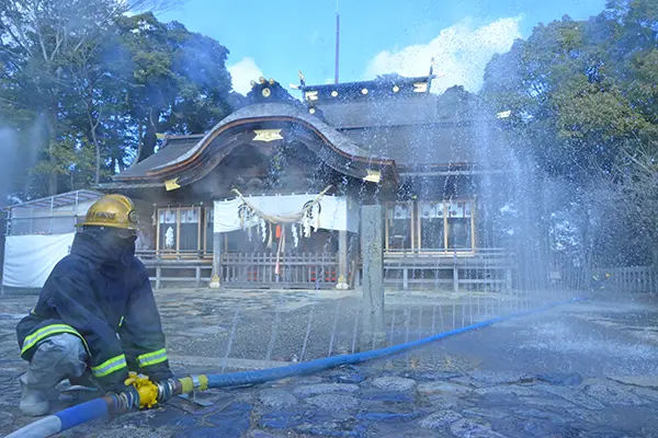 訓練は午前10時ごろ、神社西側の儀式殿から出火し、隣接する国指定重要文化財に延焼する恐れから、ただちに119番通報するとともに、初期消火と文化財の搬出を実施。駆け付けた消防隊は迅速に放水を行う――との内容で繰り広げた。