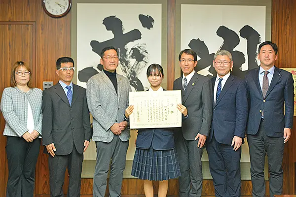 鈴木さんは16日、市役所本庁舎を訪れ、内田市長に受賞を報告した。内田市長は「鈴木さんのような若い感性を大切にし、市としても交通安全を呼びかけていく」とたたえた。小名浜二中の橋本勉校長、担任の椎名勉教諭、父・信之さん、母・梢さん、服部樹理市教育長が同席した。