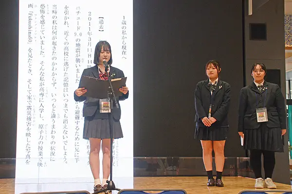 さっそく「かたりつぎ」の機会が舞い込んでいる。11日にはイオンモールいわき小名浜で開かれた県主催「3・11ふくしま追悼復興祈念行事」でも自らの言葉を紡いだ。同じ気持ちの仲間もいる。福島高専ビジネスコミュニケーション学科・2年の中島幸愛さん(17)、都市システム工学科・2年の鈴木理央さん(17)も「かたりつぎ」に加わる。