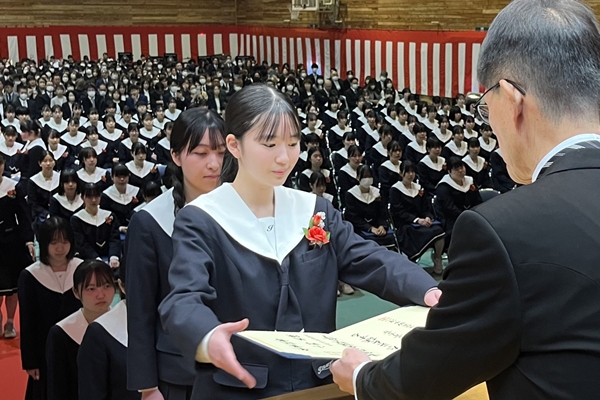 泉の卒業式は同校体育館で行われ、田中淳一校長が1人ひとりに卒業証書を手渡し、自身の好き・得意の探究、人生を自分の手で選ぶ大切さを説きながら「卒業生の皆さんが、荒波にもまれながらもたくましく生きていくことを期待している」と激励した。