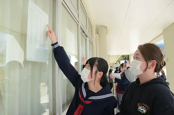 このうち平商業と四倉が統合し、4月から開校するいわき商業情報では、午後1時に平商業の南校舎に合格者の番号が張り出されると、受験生たちは不安そうな表情で番号を探し、見つかると家族、ともに受験した友人らと合格の喜びを分かち合い、ほおを紅潮させながら各科の受付で通知表を受け取った。