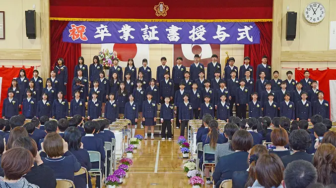 松本校長は卒業生たちの学校生活を振り返り、<1>人を思いやる優しい気持ちを持つ<2>目標を持ち努力を続ける――ことの必要性を伝えながら、「皆さんを支え導いてくださった家族、地域の皆さまや多くの方々への感謝の気持ちを大切にしてください」とはなむけの言葉を贈った。