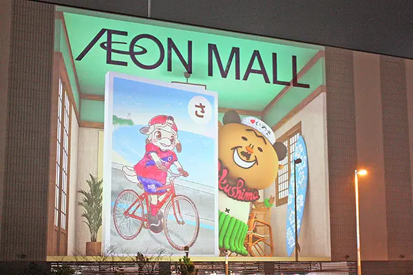 イオンモールいわき小名浜で2日、施設の外壁を活用した「はまどおり巨大かるた~プロジェクションマッピング~」が始まった。この取り組みは4月からスタートした大型観光キャンペーン「ふくしまデスティネーションキャンペーン」の一環。
