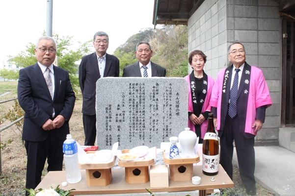 平薄磯地区で商売繁盛や大漁祈願、家内安全などを願って、江戸時代中期から歌い継がれている「あんば様の唄」の歌碑建立除幕式が5日、地元の安波大杉神社で行われた。