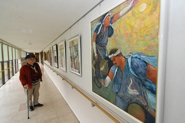 鬼芥子(オリエンタルポピー)やじゃんがら念仏踊りを題材にした作品が大内さんの代名詞で、二紀展では14度も入選。目前の美しさや迫力をただ具象していくのではなく、鎮魂や感謝の念、人生のはかなさなど、複雑な心境を豊かに表現しており、来院者や職員たちの目をひいている。