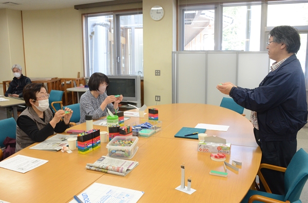 ワークショップの講師は、田人地域振興協議会の下山田誠さん(市立美術館副館長)が担当。東日本大震災と浜通り地震のメカニズムについて説明した上で、模型を使って実際に田人地区を襲った揺れについて表現した。