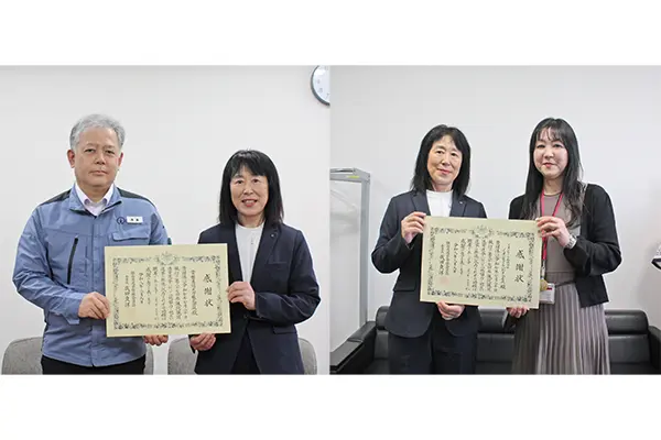 感謝状は県選管いわき地方事務局の根本和代局長(県いわき地方振興局長)から、常磐共同火力の渡辺勝栄・執行役員勿来発電所長、イオンモールいわき小名浜の進藤由紀ゼネラルマネージャー(GM)にそれぞれ手渡された。