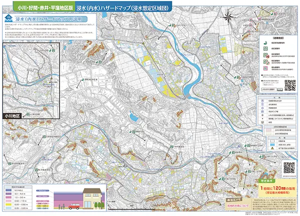 浸水(内水)ハザードマップは1時間に120mmの降雨(想定最大規模降雨)が対象。指定緊急避難場所や土砂災害警戒区域などの場所を示して、平時からの備えの参考にしてもらう狙いがある。