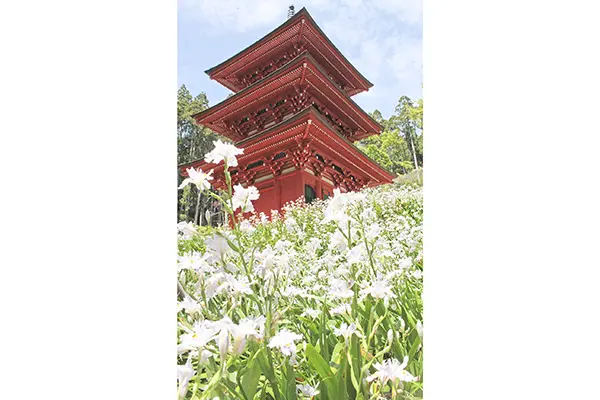 高倉町の高蔵寺では、今年もシャガが見ごろを迎えている。白くかれんな花と、鮮やかな朱色の県重要文化財・三重塔に加え、青々とした杉林と澄み渡った青空の対比が見る人を楽しませている。