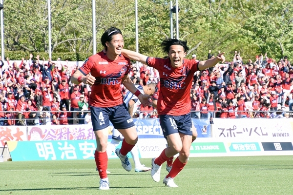いわきは本拠地での今季初白星を手にし、リーグ戦3連勝を飾った。試合は0-0で迎えた後半10分、MF石渡ネルソン(19)が敵陣右を突破し、ゴール前にクロスを上げると、オウンゴールを誘って先制。さらに14分、MF五十嵐聖己(23)が右サイドからロングスローを入れると、石渡が右足で軌道を変えてゴールを狙う。これを相手DFがクリアしたところ、詰めたDF堂鼻起暉(26)が頭で合わせて追加点を決めた。