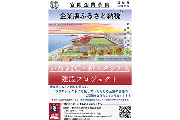 市は15日、サッカー・J2いわきFCの新スタジアム整備に合わせた「企業版ふるさと納税(地方創生応援税制)」を開始した。