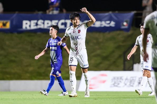 (写真:先制点を挙げて喜ぶ深港 Photo by J.LEAGUE/J.LEAGUE via Getty Images)
