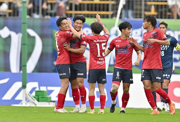 (写真:先制弾を決めて仲間と喜ぶ深港=左から2人目 Photo by J.LEAGUE/J.LEAGUE via Getty Images)