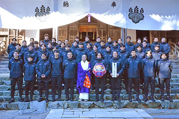 On January 5th, the J2 League club Iwaki FC held its annual “Hissho Kigan” (victory prayer ceremony) at Akaitake Yakushi Jofuku-ji Temple in Taira-Akai. Approximately 60 people, including Satoshi Okura, President of Iwaki Sports Club, Manager Yuzo Tamura, and the entire first-team squad and staff, participated in the event.