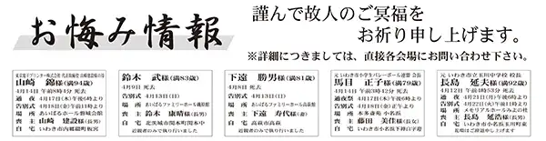 お悔やみ 4月16日(お悔やみ情報) 2025.04.17 Post この記事のタイトルとURLをコピーする こちらの情報は、各葬儀社からの提供です。 いわき市内 山崎 錦さん(94歳)内郷綴町板宮 あいぱるホール磐城会館 馬目 正子さん(79歳)小名浜下神白字迎 本多斎苑 小名浜 長島 延夫さん(92歳)小名浜玉川町東 メモリアルホールみよの杜 いわき市県外 鈴木 武さん(83歳)北茨城市関本町関本中 あいぱるファミリーホール磯原館 下遠 勝男さん(81歳)高萩市高萩 あいぱるファミリーホール高萩館 詳しくはこちら PR:地域密着型の金融機関(信用組合)。地域社会への貢献を使命とし、地元の企業や住民が対象の預金・融資などの金融サービスを提供しています。 4月15日(お悔やみ情報) 前の記事 4月17日(お悔やみ情報) 次の記事