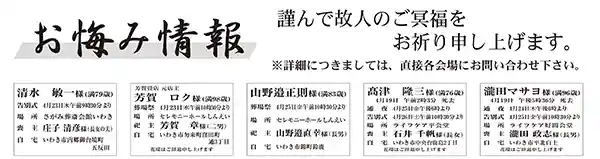 お悔やみ 4月22日(お悔やみ情報) 2025.04.23 Post この記事のタイトルとURLをコピーする こちらの情報は、各葬儀社からの提供です。 平地区 故人氏名 菅波 文弘さん(92歳) 住所 平鶴ケ井 喪主 菅波 皐月さん 告別式 24日午前11時よりJA葬祭ラポール平 清水 敏一さん(79歳)内郷御台境町五反田 さがみ葬斎会館いわき 芳賀 ロクさん(98歳)勿来町窪田町通三丁目 セレモニーホールしんえい 山野邉正則さん(83歳)錦町鈴鹿 セレモニーホールしんえい 髙津 隆三さん(76歳)中央台鹿島二丁目 ライフケア平会堂 瀧田マサヨさん(96歳)平北白土 ライフケア好間会堂 詳しくはこちら PR:全国各地から厳選した「旬の魚」を吟味しすべて「生」からお造りいたしております 4月20日(お悔やみ情報) 前の記事 4月23日(お悔やみ情報) 次の記事