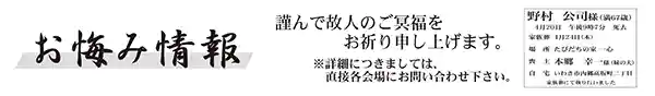 お悔やみ 4月25日(お悔やみ情報) 2025.04.26 Post この記事のタイトルとURLをコピーする こちらの情報は、各葬儀社からの提供です。 平地区 故人氏名 渡邊 隆志さん(71歳) 住所 石森一丁目 喪主 渡邊 早苗さん 告別式 30日午前11時よりJA葬祭ラポール平 四倉地区 故人氏名 加藤 多美子さん(84歳) 住所 四倉町字東二丁目 喪主 加藤 健人さん 告別式 4月23日、リリーブホールさんえいで家族葬にて執り行った 野村 公司さん(67歳)内郷高坂町二丁目 たびだちの家一心 詳しくはこちら PR:地域密着型の金融機関(信用組合)。地域社会への貢献を使命とし、地元の企業や住民が対象の預金・融資などの金融サービスを提供しています。 4月24日(お悔やみ情報) 前の記事 4月26日(お悔やみ情報) 次の記事