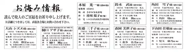 - 5月5日、山光堂メモリアルホール迎賓館で近親者にて執り行った
