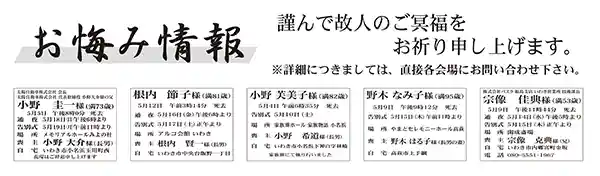 お悔やみ 5月14日(お悔やみ情報) 2025.05.15 Post この記事のタイトルとURLをコピーする こちらの情報は、各葬儀社からの提供です。 いわき市 小野 圭一さん(73歳)小名浜玉川町西 メモリアルホールみよの杜 根内 節子さん(81歳)中央台飯野一丁目 アルコ会館いわき 小野芙美子さん(82歳)小名浜下神白字林崎 家族葬ホール家族物語小名浜 宗像 佳典さん(53歳)内郷宮町金坂 開成斎場 いわき市県外 野木なみ子さん(95歳)高萩市上手綱 やまとセレモニーホール高萩 詳しくはこちら PR:地域密着型の金融機関(信用組合)。地域社会への貢献を使命とし、地元の企業や住民が対象の預金・融資などの金融サービスを提供しています。 5月13日(お悔やみ情報) 前の記事 5月15日(お悔やみ情報) 次の記事