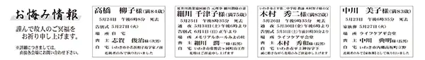 お悔やみ 5月29日(お悔やみ情報) 2025.05.30 Post この記事のタイトルとURLをコピーする こちらの情報は、各葬儀社からの提供です。 勿来地区 故人氏名 鈴木 百合子さん(92歳) 住所 山田町道端 喪主 鈴木 利三郎さん 告別式 31日午前11時よりJA葬祭ラポール錦 高橋 柳子さん(84歳)小名浜相子島字家ノ前 自宅 細川千津子さん(75歳)常磐岩ヶ岡町山王作 メモリアルホールみよの杜 木村 秀二さん(82歳)平上神谷字下 ライフケア平会堂 中川 美子さん(83歳)内郷高坂町立野 ライフケア平会堂 詳しくはこちら PR:いわき市北部地域を中心に、児童養護施設、老人保健施設、特別養護老人ホーム、ケアハウスをはじめ、診療所とデイケア、デイサービス、居宅介護支援、訪問介護、訪問リハビリと多種多様な福祉、医療事業を展開。 5月28日(お悔やみ情報) 前の記事 5月30日(お悔やみ情報) 次の記事