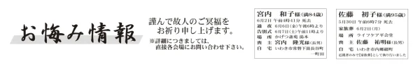 お悔やみ 6月4日(お悔やみ情報) 2025.06.05 Post この記事のタイトルとURLをコピーする こちらの情報は、各葬儀社からの提供です。 小名浜地区 故人氏名 松浦 勲さん(67歳) 住所 小名浜住吉字長泥 喪主 松浦 卓也さん 告別式 6日午前11時よりJA葬祭ラポール錦で葬場祭を行う 四倉地区 故人氏名 新妻 太十さん(91歳) 住所 四倉町細谷字御殿 喪主 新妻 富夫さん 告別式 6日午前11時よりJA葬祭ラポール四倉 宮内 和子さん(84歳)常磐下湯長谷町一町田 かげつ斎苑 湯本 佐藤 初子さん(95歳)内郷綴町 ライフケア平会堂 詳しくはこちら PR:いわき市北部地域を中心に、児童養護施設、老人保健施設、特別養護老人ホーム、ケアハウスをはじめ、診療所とデイケア、デイサービス、居宅介護支援、訪問介護、訪問リハビリと多種多様な福祉、医療事業を展開。 6月3日(お悔やみ情報) 前の記事 6月5日(お悔やみ情報) 次の記事