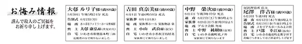 お悔やみ 6月7日(お悔やみ情報) 2025.06.08 Post この記事のタイトルとURLをコピーする こちらの情報は、各葬儀社からの提供です。 平地区 故人氏名 松本 信子さん(81歳) 住所 平下神谷字後原 喪主 松本 直樹さん 告別式 9日午前11時よりリリーブホールかべや 大邨ルリ子さん(88歳)常磐湯本町三函 あいぱるファミリーホール磐城館 吉田真奈美さん(60歳)小名浜字鳥居北 家族葬ホール家族物語泉 中野 榮次さん(90歳)錦町花ノ井 アルコ会館 勿来 尾澤 洋吉さん(90歳)鹿島町走熊字坪下 メモリアルホールみよの杜 詳しくはこちら PR:いわき市北部地域を中心に、児童養護施設、老人保健施設、特別養護老人ホーム、ケアハウスをはじめ、診療所とデイケア、デイサービス、居宅介護支援、訪問介護、訪問リハビリと多種多様な福祉、医療事業を展開。 6月6日(お悔やみ情報) 前の記事 6月8日(お悔やみ情報) 次の記事