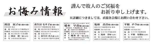 お悔やみ 6月19日(お悔やみ情報) 2025.06.20 Post この記事のタイトルとURLをコピーする こちらの情報は、各葬儀社からの提供です。 渡辺 民子さん(84歳)江名字北口 22日あいぱるホール泉会 萩生田セキ子さん(94歳)平下荒川字久世原 24日せきのホール 橋本 早苗さん(84歳)平南白土字八ツ坂 21日ライフケア平会堂 鬼頭 貞彦さん(93歳)植田町中央 16日ライフケア勿来会堂 平根 チウさん(100歳)平作町 16日ライフケア好間会堂 詳しくはこちら PR:いわき市北部地域を中心に、児童養護施設、老人保健施設、特別養護老人ホーム、ケアハウスをはじめ、診療所とデイケア、デイサービス、居宅介護支援、訪問介護、訪問リハビリと多種多様な福祉、医療事業を展開。 6月18日(お悔やみ情報) 前の記事 6月20日(お悔やみ情報) 次の記事