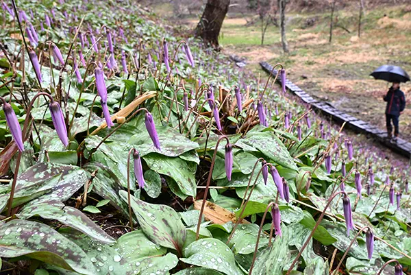 4日は二十四節気の「清明」で、春のうららかな日差しを受け、万物が若返り、清々しく明るく美しい頃とされる。小名浜のいわき金成公園内の岩出の郷では3日、見ごろを迎えた、斜面を紫色に染め上げるユリ科の多年草カタクリが雨に打たれて花弁を閉じ、降り注ぐ陽光を待ちわびていた。