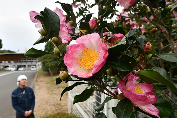 設備の工事に訪れていた好間町の会社員板橋拓海さん(23)は仕事の合間にサザンカを見つめ、「紅葉が色づく園内に咲く鮮やかな花に癒やされました」と話していた。
